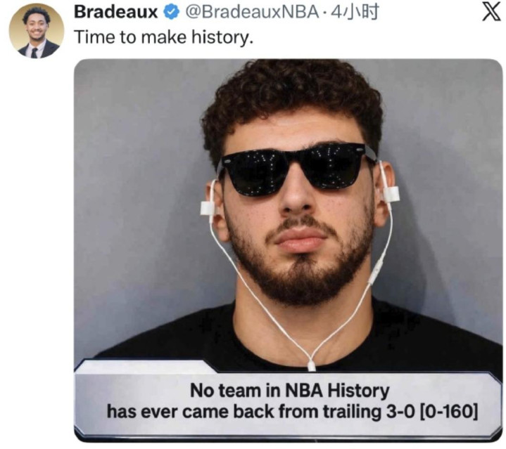 大比分落后的火箭,现在反而是信心满满。休斯顿记者Bradeaux还晒图写道:“是时候创造历史了。”配图为申京的合成照,原图是2016年总决赛,骑士1-3落后勇士时,詹姆斯接受采访的画面。图中写着:“NBA历史上还没有球队能在0-3落后时完成逆转,0胜160负。”