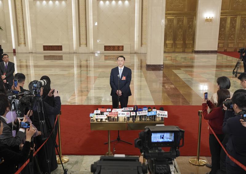 3月12日,第十四届全国人民代表大会第四次会议第三场“部长通道”集中采访活动在北京人民大会堂举行。这是自然资源部部长关志鸥接受媒体采访。新华社记者 王曦 摄