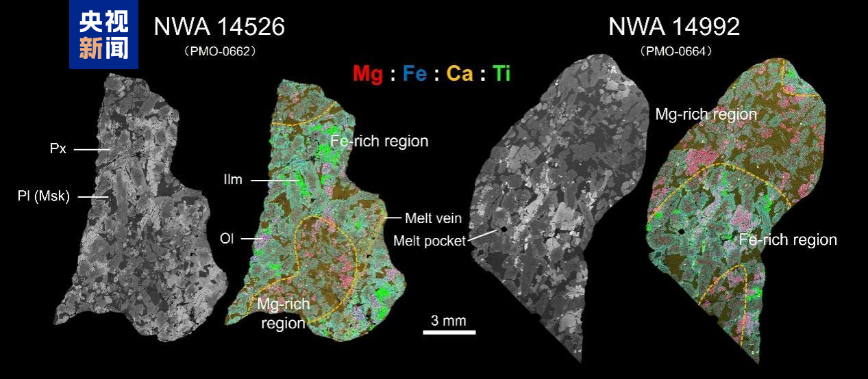 年轻的月海玄武岩是研究月球晚期火山活动的关键对象,科学界一般认为,自月球形成以来,其内部的玄武岩岩浆活动以简单结晶为主,缺乏类似地球岩浆房常见的动态过程。研究团队利用扫描电镜、电子探针等分析技术,对两块发现于2021年的月球陨石NWA 14526和NWA 14992开展了详细研究。